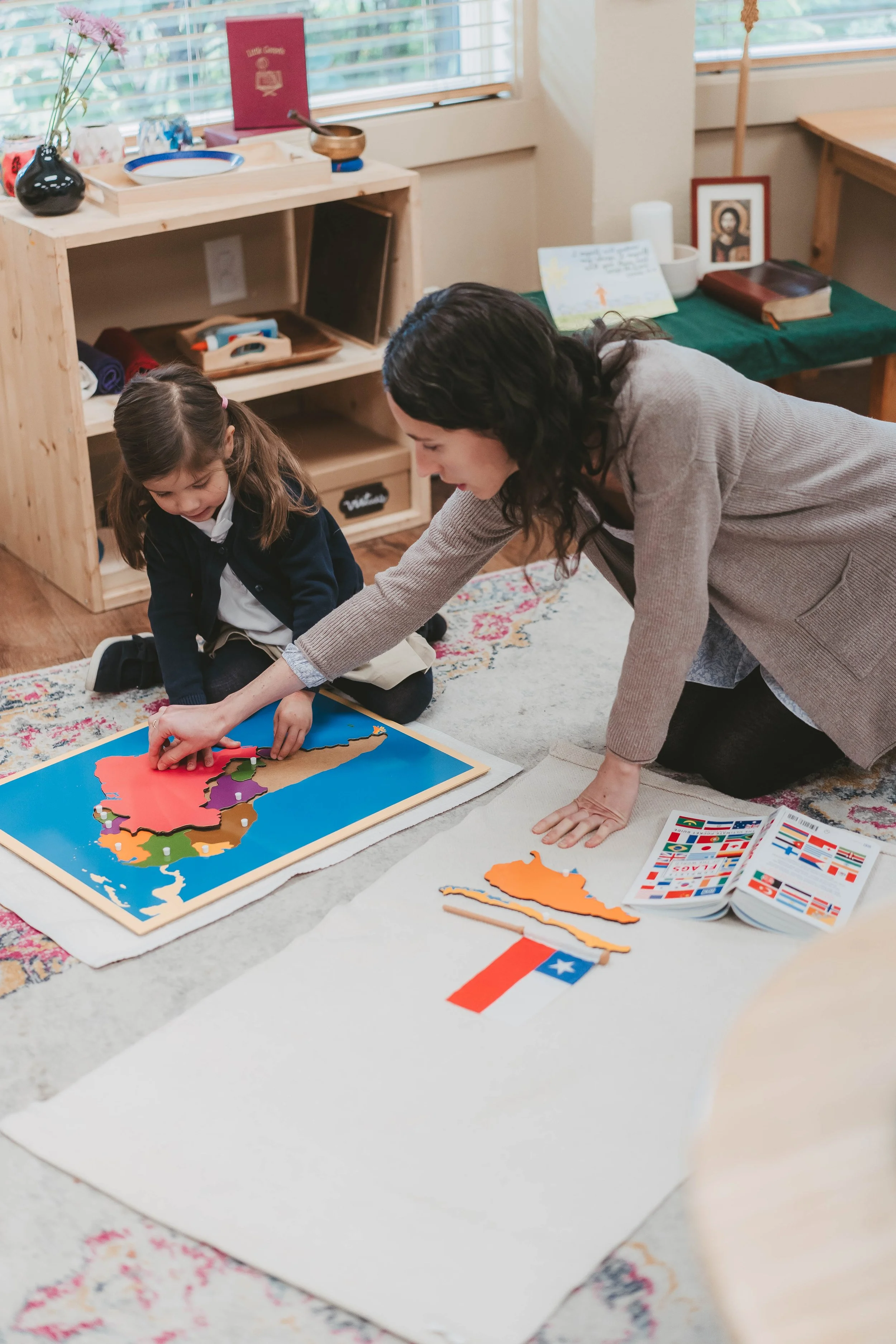 The primary class, often called "the children's house," is an opportunity for children to discover their incredible capabilities. Young children are incredibly sensorial and our hands-on materials are designed to satisfy their inner drive to touch everything! The classroom environment is calm and peaceful and allows freedom to explore, work individually as well as with classmates, and begin to understand the fundamentals of peace-making. Integral to our program is time spent exploring outdoors, investigating the world and the wonders of imaginative play. Through the Catechesis of the Good Shepherd, each child is able to explore her own unique relationship with our loving God, as well as grow in her personal development of the virtues of peace, patience, kindness, gentleness and self-control.